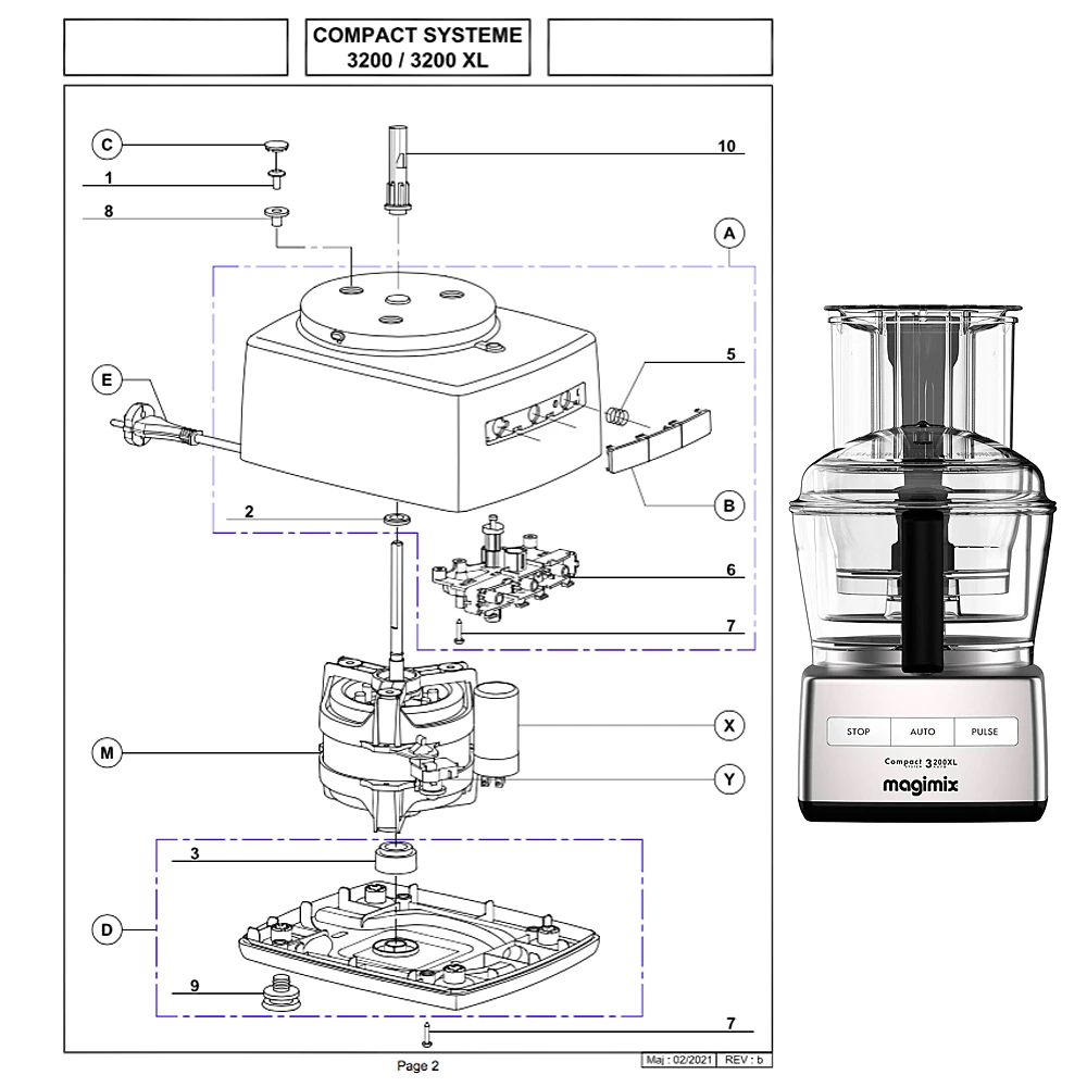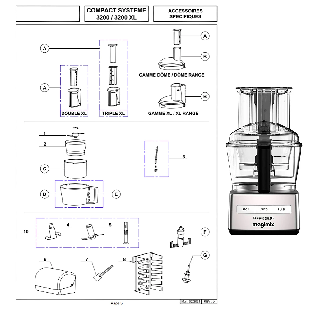 | Désignation | Poussoir 3200, Double poussoir XL grand et petit, Y Relais moteur, Moteur, Cuve poignée Blanche, Cuve poignée Rouge, Cuve poignée Noire, Midi cuve 3200 (ne convient pas au 3200XL), Midi cuve 3200 XL (ne convient pas au 3200), Mini cuve, Couvercle 3200 tous modèles sauf XL et modèle 18326F (voir couvercle dome), couvercle 3200 dôme uniquement modèle 18326 F, Couvercle XL insert blanc Tous modèles sauf 18370F, Couvercle XL insert noir Tous modèles sauf 18371F, Couvercle 3200 XL poignée Blanche uniquement 18370F, Batteur à blancs 3200 uniquement, Couvercle 3200 XL poignée anthracite uniquement 18371F, Couvercle 3200 XL insert rouge, Batteur à blanc 3200 XL uniquement, Disque Eminceur 2mm/Râpeur 2mm (non XL), Disque Eminceur 4mm/Râpeur 4mm (Non XL), Disque éminceur 4 mm XL, Disque éminceur 2 mm XL, Disque Eminceur 6 mm, Disque Râpeur 6 mm, Disque Râpeur 2mm XL, Disque râpeur 4 mm XL, Disque Parmesan, Disque Julienne, prolongateur 3200 XL, Prolongateur disques carré 3200 UNIQUEMENT, centreur de couteau, Pétrin, Mini couteau, Couteau métal Noir remplace le blanc ex 17419, Spatule, Boîte de rangement (vide), Casier 6 disques, Presse-agrumes Noir, Centrifugeuse 3200 uniquement, Centrifugeuse/coulis 3200 et 3200 XL, Blendermix, Lot de 4 pieds noirs ronds, Livre de recettes |